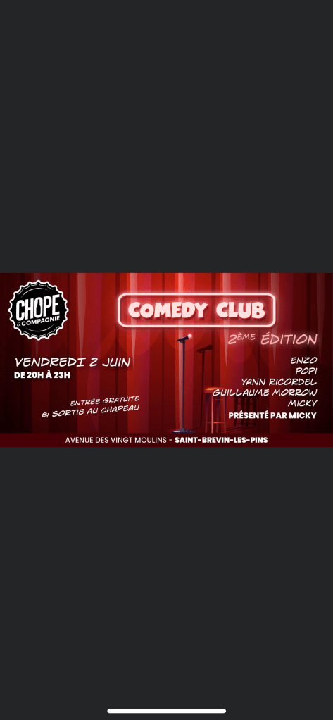 Ce soir rendez vous à Saint Brevin les pins :) Publié par enzo leminet le 2 juin 2023 Pour un comedy club à Choppe et Compagnie je serais à Saint Brevin les pins ce soir avec d’autres humoriste rendez vous 20h00 sur place !! Partager : Partager sur X(ouvre dans une nouvelle fenêtre) X Partager sur Facebook(ouvre dans une nouvelle fenêtre) Facebook J’aime chargement… Similaire